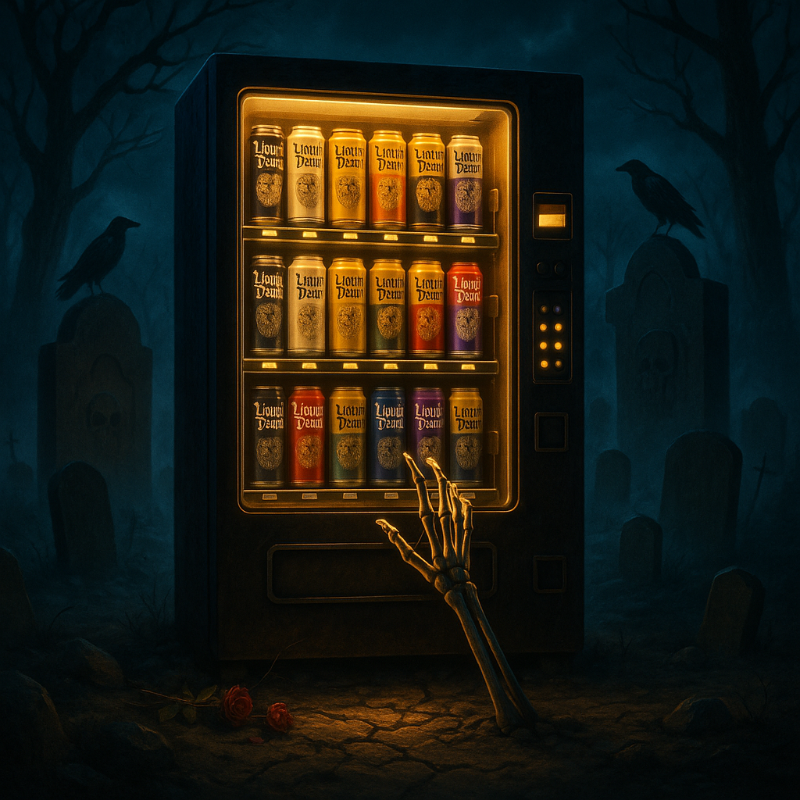 A vending machine that doesn’t just serve water - it summons it. Set in a graveyard with a skeletal hand reaching for a can, this concept plays on the idea that Liquid Death is irresistible even in the afterlife. Designed as a surreal social asset or motion piece, it taps into the brand’s humor and horror crossover.