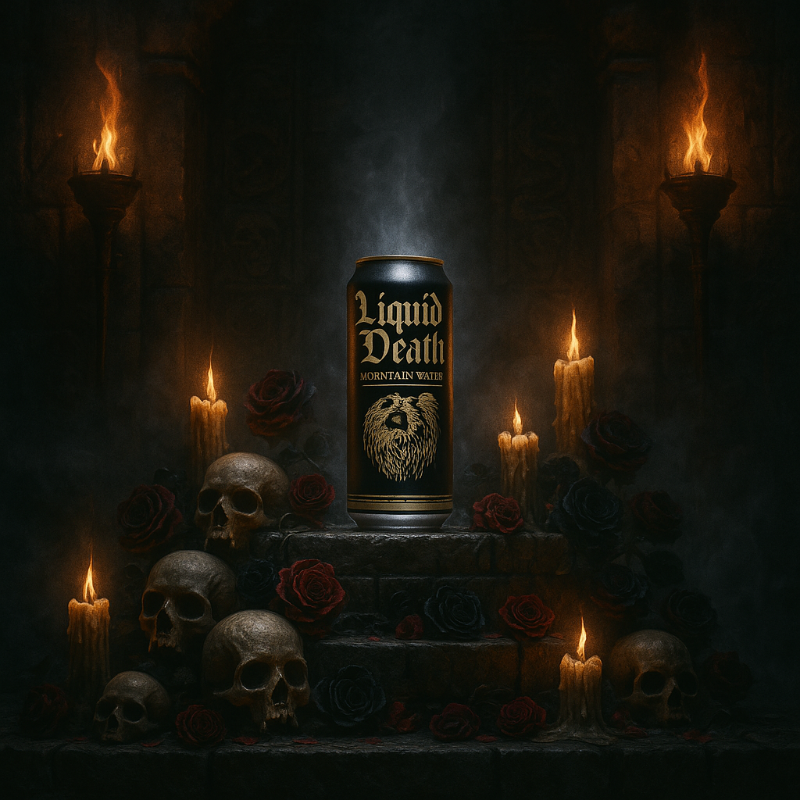 What if water was worshiped like a dark ritual? This concept transforms the can into a holy relic, surrounded by skulls, roses, and flames. Perfect for a digital campaign or social drop that leans into Liquid Death’s gothic mystique, creating a product-as-icon narrative.